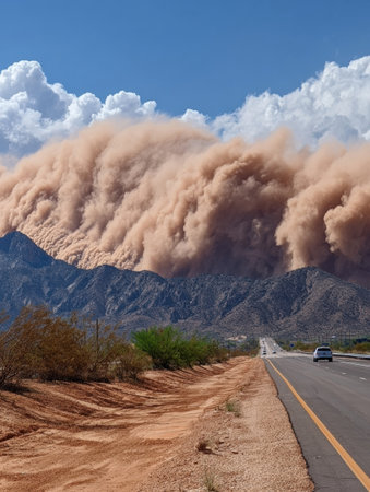 A massive dust storm looms over the mountains, with swirling clouds of sand dramatically altering the sky and obscuring visibility along the highway.