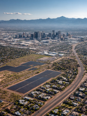 Solar panels stretch across the land while a city skyline rises in the background under a clear blue sky, capturing the essence of sustainable energy.