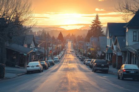 Sunset street view in charming town urban landscape photography peaceful atmosphere