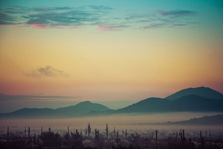Fog hovering over the mountains of central Arizona with Saguaro cactus and other desert plants