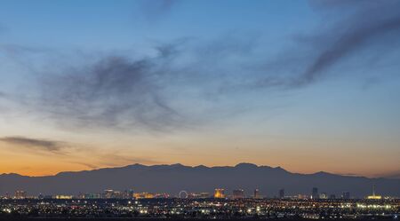 Sunset aerial view of the strip with mountain behind at Las Vegas, Nevada
