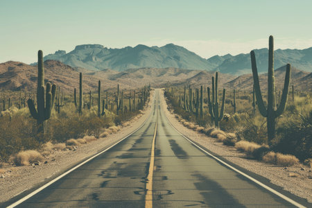 An endless road cuts through the heart of a vast desert landscape, lined with cactus plants against the hot desert sun.