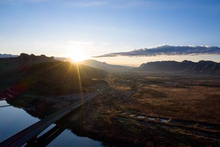 Aerial view sunrise with sunrays in Moab Utah