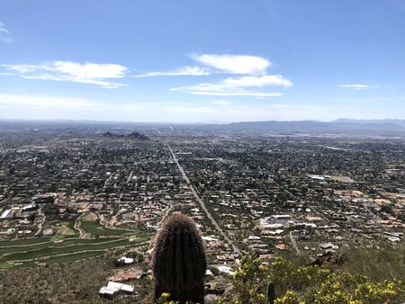 Overlooking view of a town area from the hiking trail at Camelback Mountain at Phoenix, Arizona. View of buildings and roads below near the mountains against the blue sky background.