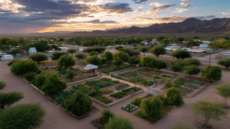 This aerial photograph captures a beautiful community garden located in a desert environment. Surrounded by mountains, the scene showcases vibrant greenery under a picturesque sunset sky, reflecting harmony with nature.
