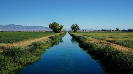 A view of a canal in the middle of a field with trees