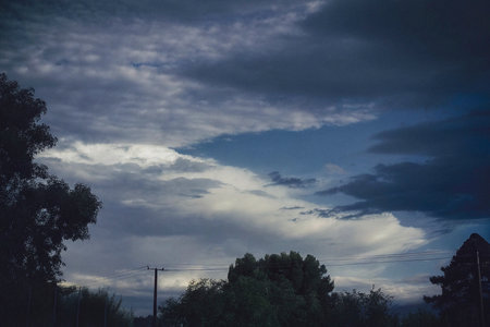 Cloudy blue sky with dark clouds. Beautiful nature background. Toned.
