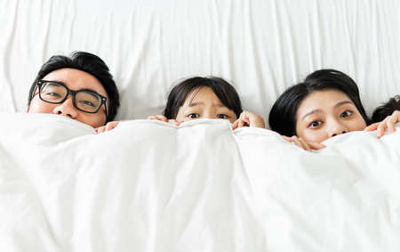 Little toddler girl having fun in bed after wake up. Healthy child jump and play hide and seek with parents. Adorable kid at home, family lifestyle.