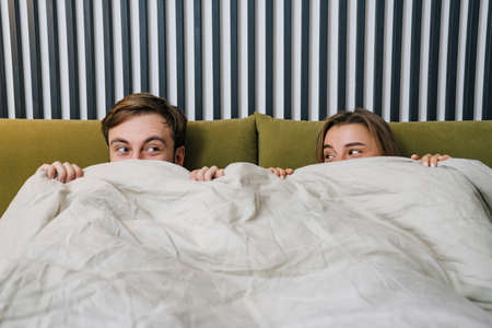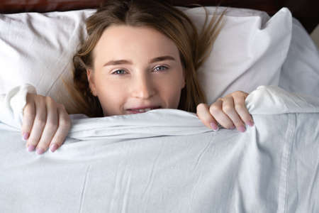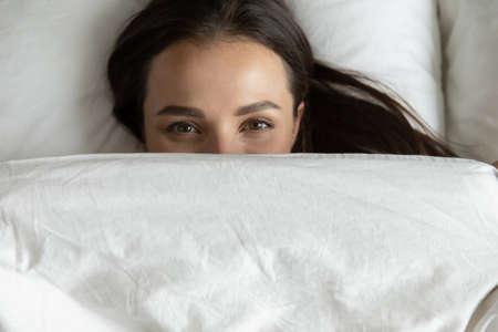 Good morning. Portrait of happy joyful young female resting relaxing lying in bed and looking at camera covering half of face with blanket and peering out with fun in eyes joking playing having fun