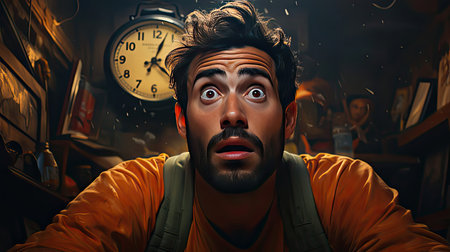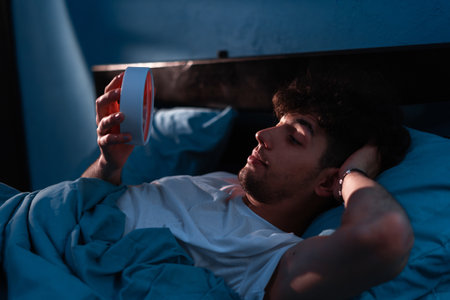 Sleepless man suffering from insomnia, stress. Tired and exhausted guy with clock in his hands. Awake in the middle of the night. Frustrated person with problem.