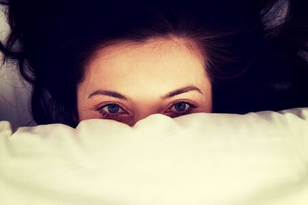 A close-up, dramatic shot of a young woman's eye, wide open in bed in the dark. Her face is partially obscured by covers, and a sliver of light illuminates her eye, suggesting insomnia, fear, or wakefulness.