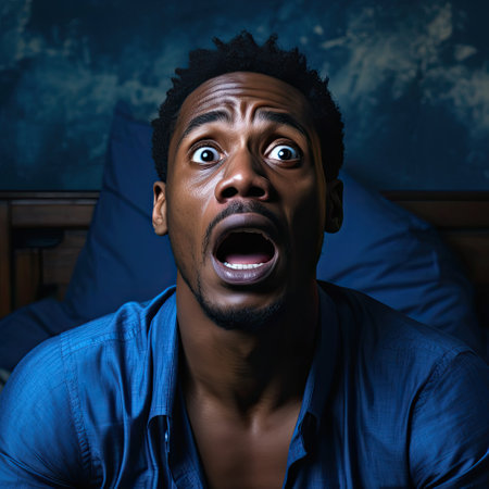 A young African man in his 20s reflects profound fatigue as he yawns widely against a drowsy dark blue pastel backdrop.