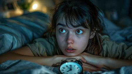 A young woman lying in bed, eyes wide with shock as she looks at her alarm clock showing a late time.