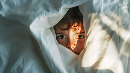 A young child peeks out from under soft covers, showcasing curiosity and innocence. The gentle lighting highlights their expressive face, creating a cozy atmosphere.