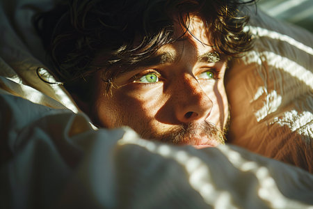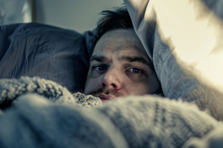 A young man lies in bed with a cold, looking contemplative while surrounded by soft pillows and warm light, capturing a moment of serene relaxation.