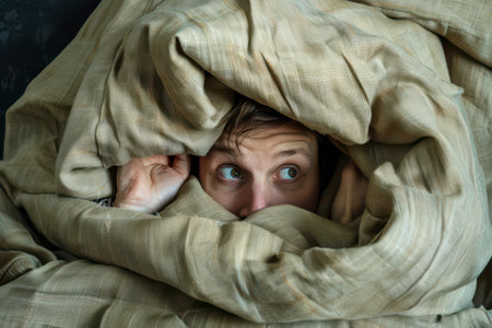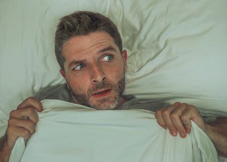 dramatic portrait of stressed and scared man alone in bed awake at night in fear after having a nightmare feeling paranoid holding the blanket in funny panic face expression