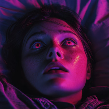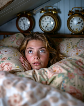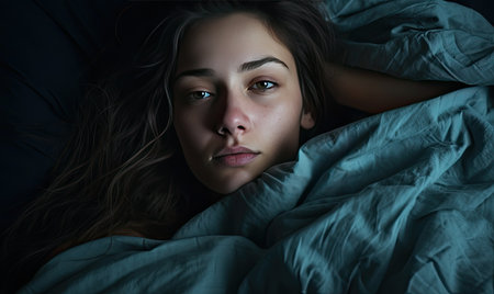 A sleepless young woman's portrait as she lies in bed, eyes wide open in the darkness.
