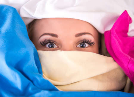 great mood after sleep. Good dream. Portrait of a woman after sleep. Mouth covered with a blanket looking at the camera