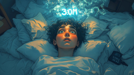 Young person suffering from insomnia lying awake in bed at 3:00 am
