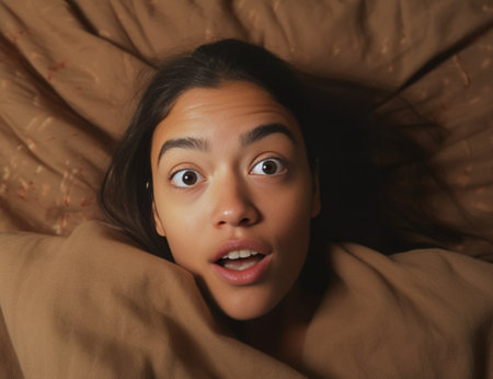 Young girl with a frightened expression wakes up from a nightmare in bed.