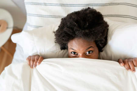 beautiful young African woman in tank top lying in bed cover face with sheet