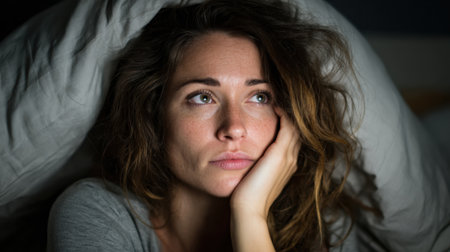 An attractive woman lying on her bed at night, looking pensive and unable to sleep
