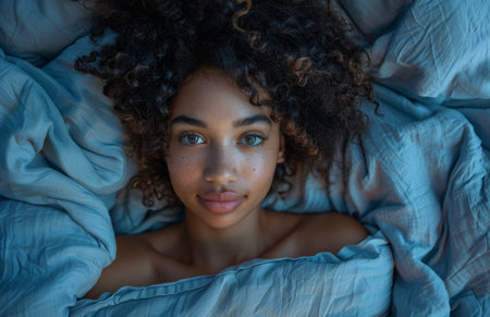 Peaceful Morning Portrait of a Young Woman Wrapped in Blue Sheets, Waking Up Refreshed.