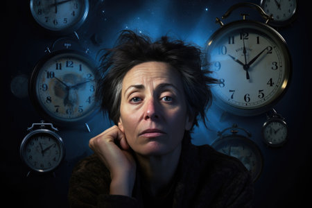 Sleepless exhausted middle-aged woman against the background of alarm clocks and a blue background. Wakefulness concept, insomnia, circadian rhythm disorder
