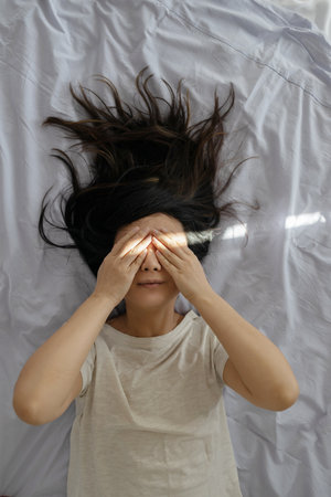 Woman lying on bed covering her face with hands, her hair spread out over the pillow. She is wearing a loose shirt in a relaxed posture on the soft bedding