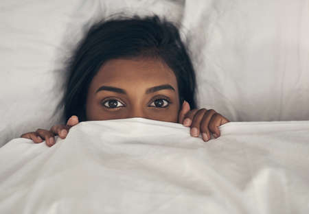 Dont tell anyone that Im here. Shot of a young woman peeking from under her duvet while lying in her bed.