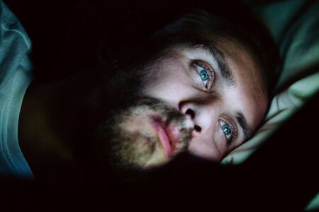 Bearded caucasian male is watching something on his mobile phone in bed at night. He is clearly very tired but cannot sleep.