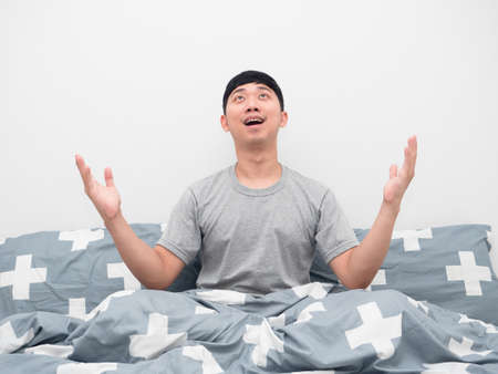Man stretching his arms and look to camera when waking up in his bed at early dark morning
