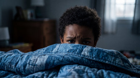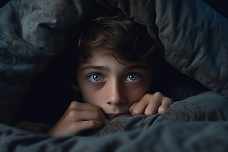Scared child hiding under blue quilt in dark bedroom, fearful young boy peeking over blanket with worried eyes at night.