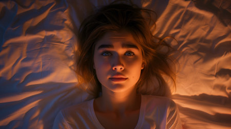 A young woman lying on a bed, looking contemplative with tousled hair on wrinkled sheets Soft lighting creates a serene atmosphere