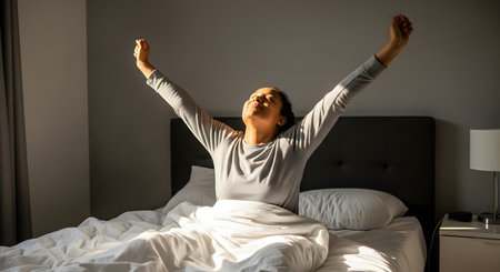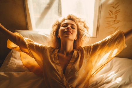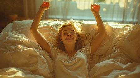 A woman stretches to greet the morning sun from her cozy bed on a bright day in a sunlit bedroom