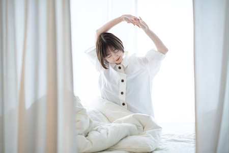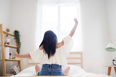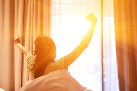 Good morning new day. Asian woman wake up and sitting body stretch on bed beside window in bedroom