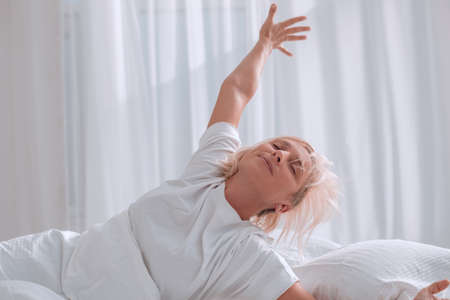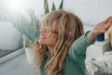 middle-aged adult woman waking up in the morning in the bedroom happy with energy