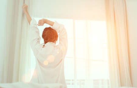 Young woman wake up in the morning and sitting on bed at window door side relaxing in holiday with sunlight, back view