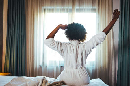 Portrait of smiling African-American woman waking up in morning and stretching, copy space