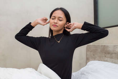 Portrait of young Asian woman stretching in bed after wake up in the morning