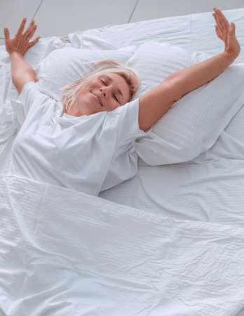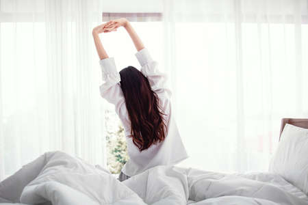 Woman stretching hands in bed after wake up in the morning, Concept of a new day and joyful weekend.