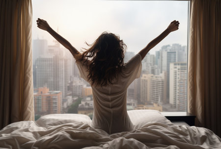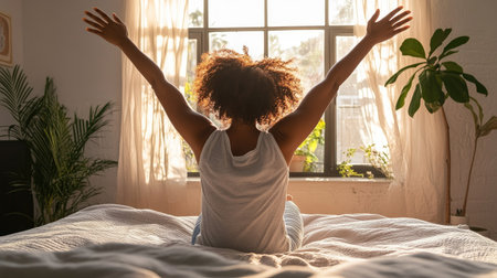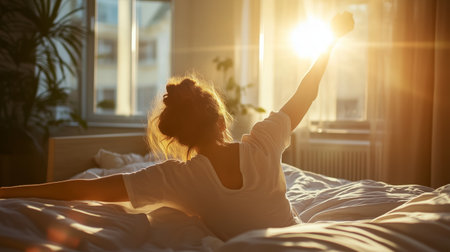 A woman is seen from behind, sitting up in bed and stretching her arms towards the bright morning sun filtering through the curtains. The room is filled with a warm, golden glow, creating a serene and peaceful atmosphere as she begins her day.