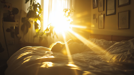 Sunrise light streaming through curtains onto a cozy bedroom with a person relaxing in bed during morning hours