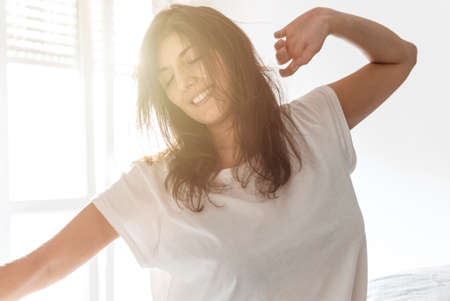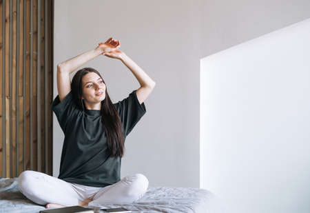 Healthy asian brunette happy girl in a white t-shirt, is awakening with smile and stretching arms after well sleep sitting in a cozy bed, starts her day with great mood, having a good nights sleep