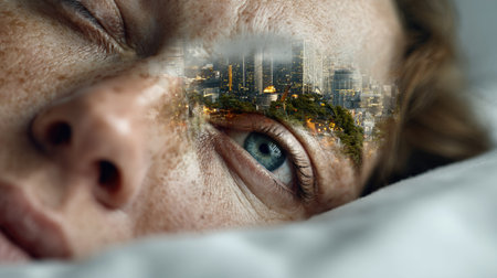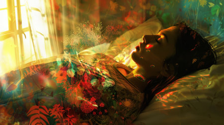 A woman lies peacefully on a bed, immersed in a deep and healing sleep. Surrounding her are mesmerizing abstract cosmic patterns that evoke a sense of serenity and tranquility, enhancing the soothing atmosphere of her restful state.