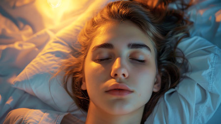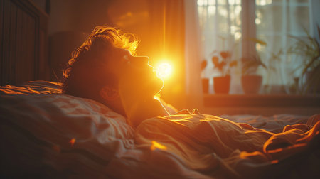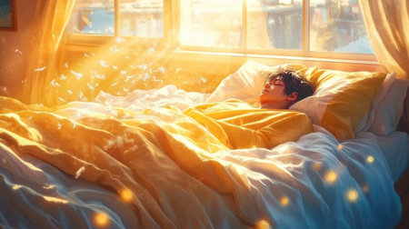 A serene scene of a young person peacefully sleeping in a cozy bedroom Bathed in warm sunlight, evoking feelings of tranquility, comfort, and relaxation.