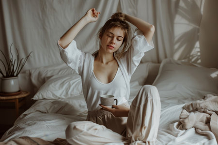 A young woman enjoys a peaceful morning stretch in her sunlit bedroom, embracing a moment of relaxation and positivity as she welcomes a new day.