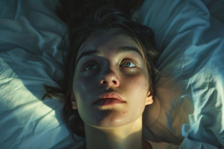 A sleepless young woman's portrait as she lies in bed, eyes wide open in the darkness.
