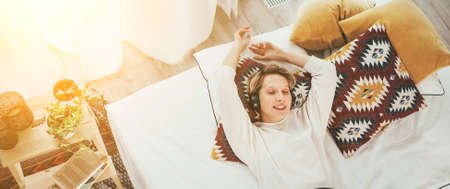 Smiling young female lying on cozy bed dressed pajamas listening to music using wireless headphones. Audio playing modern technology and free time spending concept