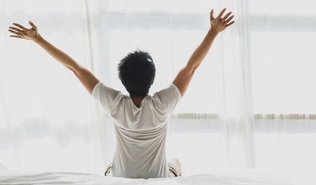 Back of view man wake up and stretching on bed in bedroom in the morning.at home in holiday.